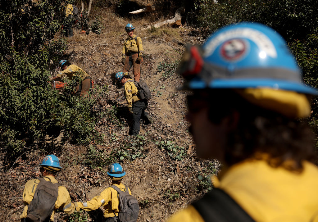 A fire crew clears brush away from the side of Pacific Coast Highway in Santa Monica, Calif. Wildfire veterans say an immigration raid last week targeting fire crews in Washington state was an alarming development that could threaten the nation’s wildfire readiness. (Photo by Justin Sullivan/Getty Images)