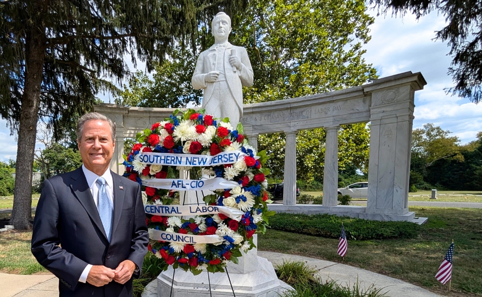 U.S. Congressman Donald Norcross at the Peter J. McGuire Memorial in Arlington Cemetary, Pennsauken. Credit: Matt Skoufalos.