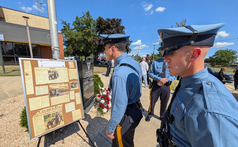 Pennsauken police officers regard a corkboard with press clippings from the passing of Ptl. George Bowman in 1995. Credit: Matt Skoufalos.