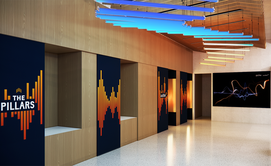 A central court will greet visitors to The Pillars, according to Audible, complete with the company’s listening booths. At opening, three businesses will occupy space (see below). The fourth tenant has not been announced; however, Audible said the anchor food and beverage occupant will debut in 2026. The space also aims to tap into experiential brick-and-mortar excitement, and will offer interactive and unique on-site activities to that end.