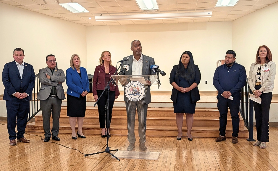 Camden City Mayor Vic Carstarphen addresses the media at the Malandra Hall Community Center. Credit: Matt Skoufalos.