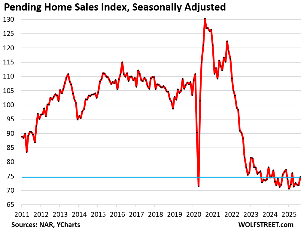 There was a lot of housing-promo hoopla in the media this morning about that 4.0% month-to-month increase in pending sales of existing homes in August, sign of a sudden burst of demand due to lower mortgage rates, or whatever, written by goofballs or AI that never look at a chart.