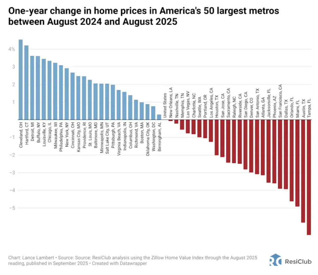 At the end of August 2025, 25 of the nation’s 50 largest metro-area housing markets (50%) had falling year-over-year home prices.