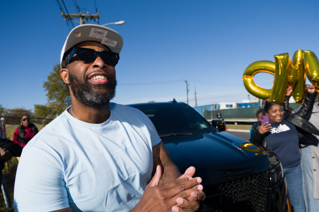 James Comer is greeted by friends and family upon his release from Northern State Prison in Newark on Oct. 17, 2025. (Photo by Steve Hockstein/HarvardStudio.com)