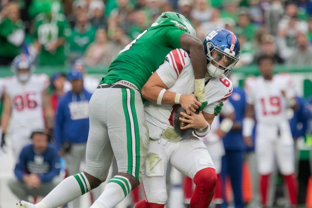 The front dominated rookie QB Jaxson Dart, finishing with five sacks and seven tackles for loss. The Giants managed only 68 rushing yards on 21 attempts. Jordan Davis and Jalen Carter led an interior surge that dictated down and distance, letting Vic Fangio’s pass-rush plan hum.