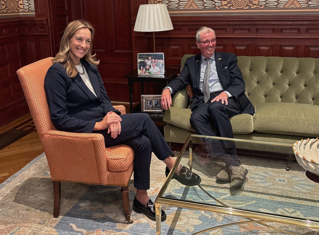 Mikie Sherrill, New Jersey’s governor-elect, meets with outgoing Gov. Phil Murphy at his Statehouse office in Trenton on Nov. 5, 2025. (Dana DiFilippo | New Jersey Monitor)