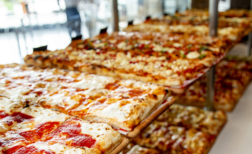 At SQ Pizza, the menu revolves around authentic Roman-style square-shaped pizza that can be ordered by the slice or pan. Made from high-hydration, long-rising dough crafted from non-GMO wheat flour, the pizza comes in varieties ranging from classic margherita to buffalo chicken.