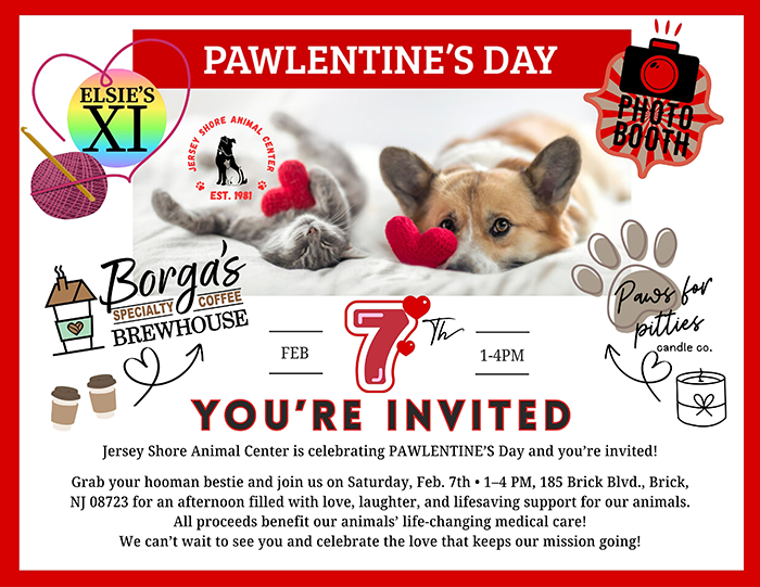 BRICK — The Jersey Shore Animal Center will host a Pawlentine’s Day fundraiser Feb. 7 at Borgas Specialty Coffee Brewhouse to raise money for the care and treatment of animals at the shelter.