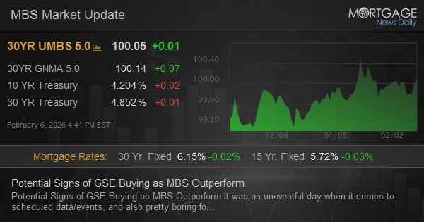 Share Facebook Twitter LinkedIn Pinterest Email Copy Link Potential Signs of GSE Buying as MBS OutperformBy: Mortgage News Daily | Published: 2026-02-06 20:31:00 | Source: www.mortgagenewsdaily.com Place your ad here (700×100)Potential Signs of GSE Buying as MBS Outperform 2 Hours, 12 Min agoPotential Signs of GSE Buying as MBS OutperformIt was an…… Read Morebuying GSE MBS Outperform Potential signs
