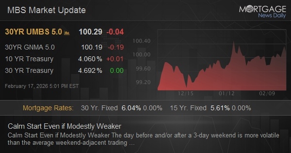 Share Facebook Twitter LinkedIn Pinterest Email Copy Link Calm Start Even if Modestly WeakerBy: Mortgage News Daily | Published: 2026-02-17 21:27:01 | Source: www.mortgagenewsdaily.com Place your ad here (700×100)Calm Start Even if Modestly Weaker 1 Hour, 39 Min agoCalm Start Even if Modestly WeakerThe day before and/or after a 3-day…… Read MoreCalm Modestly start weaker