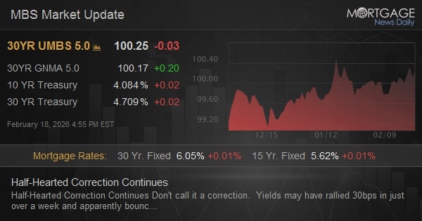 Share Facebook Twitter LinkedIn Pinterest Email Copy Link Half-Hearted Correction ContinuesBy: Mortgage News Daily | Published: 2026-02-18 21:22:14 | Source: www.mortgagenewsdaily.com Place your ad here (700×100)Half-Hearted Correction Continues 1 Hour, 38 Min agoHalf-Hearted Correction ContinuesDon’t call it a correction. Yields may…… Read MoreContinues Correction HalfHearted