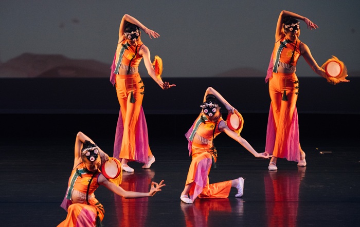 Learning how to handle props is part of the challenge for the company’s traditional dance students. A well-drilled ensemble of 11 young ladies performed with fringed tambourines in Echoes of the Golden Drum, striking coy poses against an animated background of drifting flower petals, and performing acrobatic stretches. They seemed even more self-assured in Qiang Bells in Joyful Dance, where the lithe, swift teens spun flower blossoms attached to their shoulders with strings.