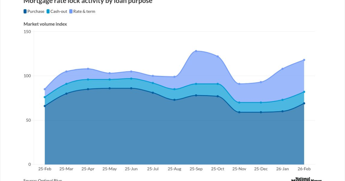 Total rate-lock volume increased 9% month over month and nearly 40% on an annual basis, according to Optimal Blue’s latest Market Advantage report. Purchase lock activity rose more than 14% from January and 5% compared with a year ago, pulling down